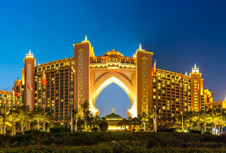耗資15億美金,以傳說中失落的海底古城亞特蘭提斯為藍本打造。座落在朱美拉棕櫚島外環中央最重要的頂端位子,象徵它無法取代的皇冠地位,設計豪華的飯店接待大廳,這裡的雕塑,都訴說著無限想像的傳奇故事,亙古的傳說神話在眼前真實重現。海洋是Atlant The Palm最重要的主題之一,約有64個足球場面積大的度假村,1539的客房及海濱遊樂場所,不管是大人或小孩都值得停留