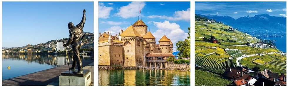經由著名的黃金之路前往蒙頭位於日內瓦湖畔,遠方是白雪覆蓋的巍峨阿爾卑斯山脈,曾經來過的盧梭、詩人拜倫、文人海明威「佇立於同一座湖畔,看著相同的風景」。